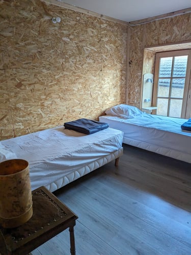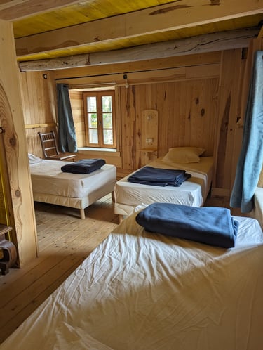 15 places réparties en 1 chambre double et deux dortoirs, de 4 et 5 lits + mezzanine. Lits simples, équipés d'une literie neuve et confortable.