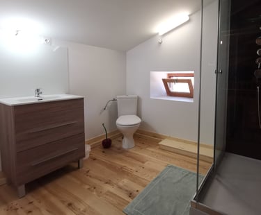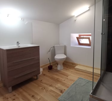 Sanitaires privés avec douche et WC dans chaque chambre . Sanitaires partagés pour les dortoirs.