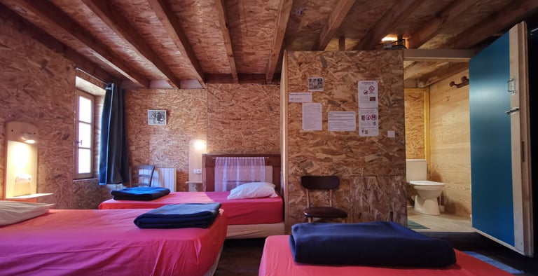 15 places réparties en une chambre double, une chambre quadruple, et deux dortoirs. Lits simples, équipés d'une literie neuve et confortable.